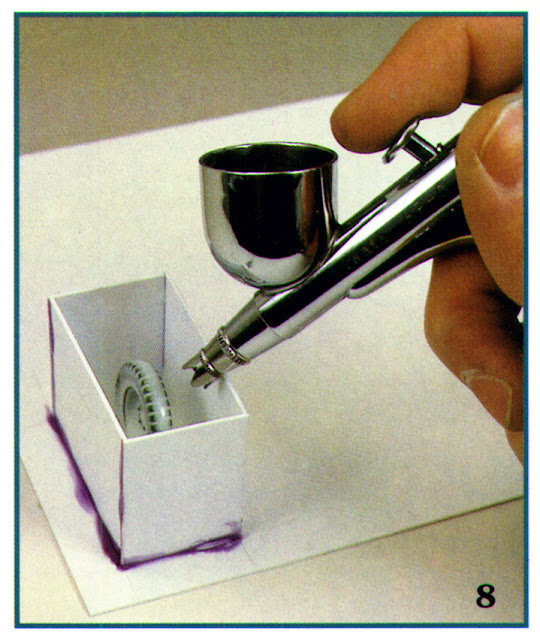 Teniendo preparada ya la mezcla comienza la operación de vertido que hemos de realizar lentamente y sin prisas; (7) tras verter una pequeña cantidad de silicona sobre las piezas tiramos aire con el aerógrafo a baja presión, con objeto de que se forme una fina película que recubra las piezas evitando la aparición de burbujas de aire (8) (esto puede hacerse también con un pequeño pincel, aunque resulta más tedioso), acto seguido continuamos con el vertido paulatino hasta llegar al borde superior del cajón de plástico (9).